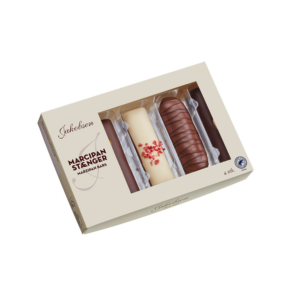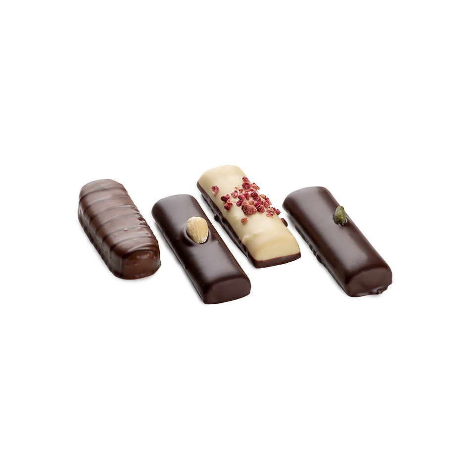 Batony marcepanowe w czterech smakach: baton z nadzieniem nugatowym. Baton z dodatkiem pistacji, udekorowany orzechem pistacjowym. Baton w białej czekoladzie z posypką malinową ze spodem z czekolady deserowej. Baton w czekoladzie deserowej dekorowany migdałem.